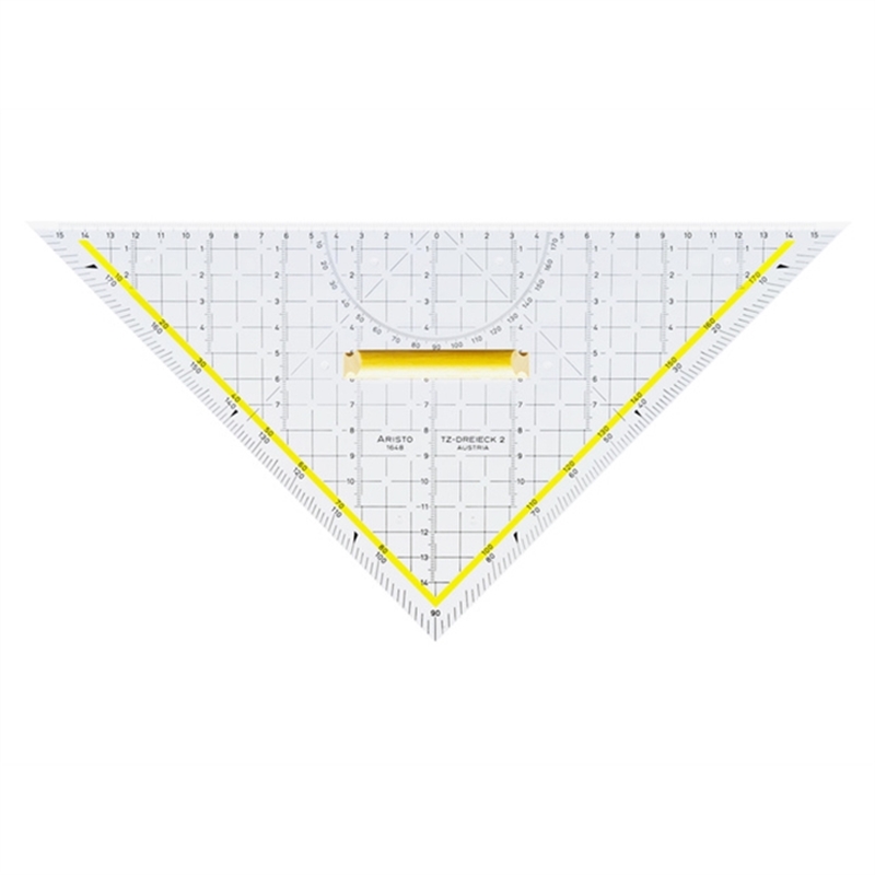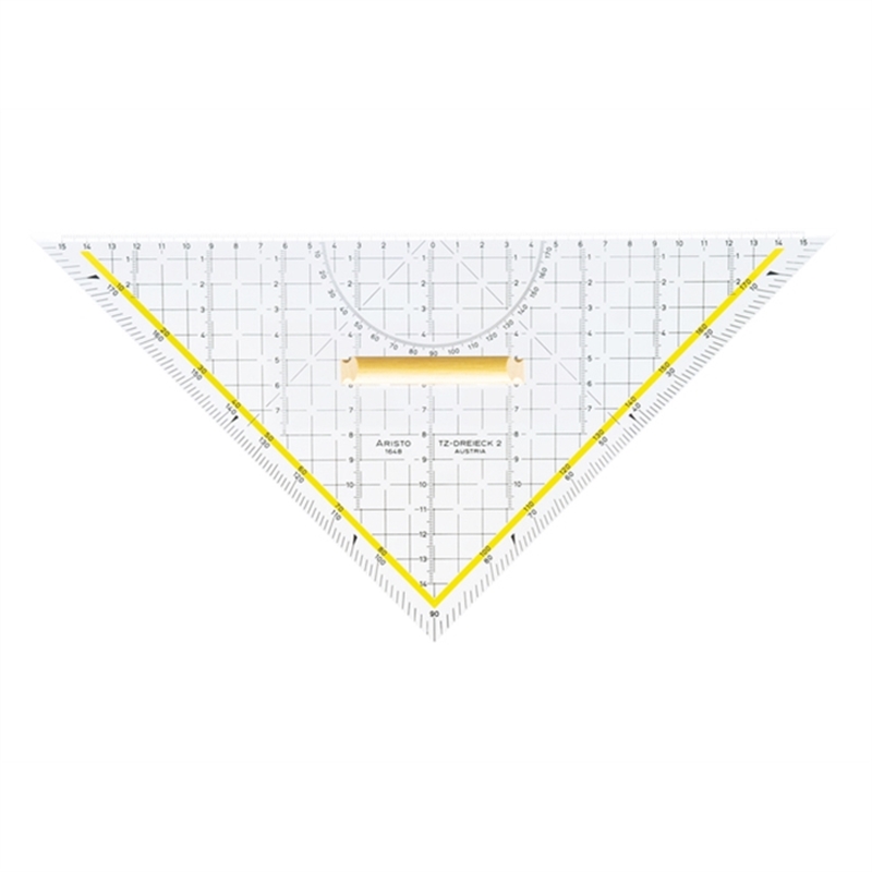 Multifunktionales Zeichendreieck. Als Leisten-, Winkel- oder Parallellineal verwendbar. Mit horizontaler und vertikaler Teilung und Winkelmesser. Holzgriff. Facette an der Längsseite. Merkmale entsprechen der Ö-Norm. Länge 32,5 cm. Material: Plexiglas®. Transparent